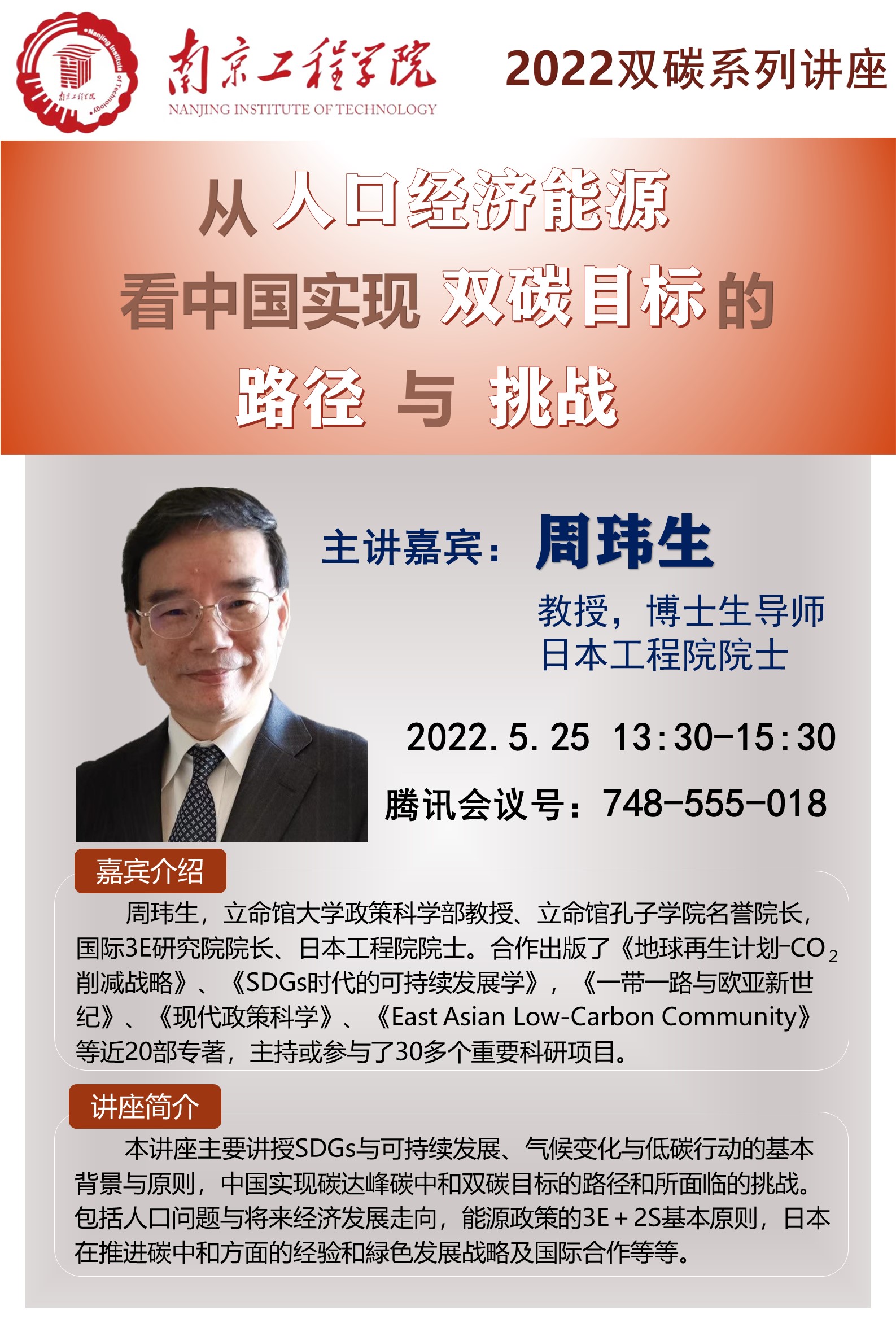 周玮生院士简介:博士,立命馆大学政策科学部教授、立命馆孔子学院名誉院长国际3E研究院院长、日本工程院院士。历任日本新能源产业技术综合开发机构(NEDO)产业技术研究员,地球环境产业技术研究机构(RITE)主任研究员,研究顾问、立命馆大学可持续发展学研究中心首任主任,大坂大学特任教授、东京大学・京都大学客座研究员,浙江大学,大连理工大学,北京大学等客座教授等职。出版(合著)了《地球再生计划―CO2削减战略》、《SDGs时代的可持续发展学》,《一带一路与欧亚新世纪》、《现代政策科学》、《East Asian Low-Carbon Community》等近20部专著,主持或参与了30多个重要科研项目。