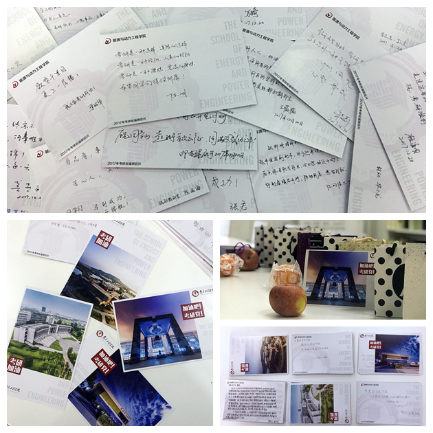 为鼓舞考研学子士气,帮助他们缓解心理压力,从祝福卡的设计、礼物的遴选到活动参与形式,学院在策划方面可谓煞费苦心:祝福卡片是专门设计的,主题图案来自学院学生的摄影作品,卡片文案励志向上;祝福词是老师和学弟学妹们亲手书写的,字里行间,情真意切,部分祝福卡还内置大奖“彩蛋”;橙子和苹果都是网红款,寓意心想事成、平平安安,包装文案亦是精心挑选的……暖心细节处处体现。备考学子纷纷表示,“学院的安排很贴心,有温暖也有惊喜,真真切切感受到了鼓舞和愉悦”。