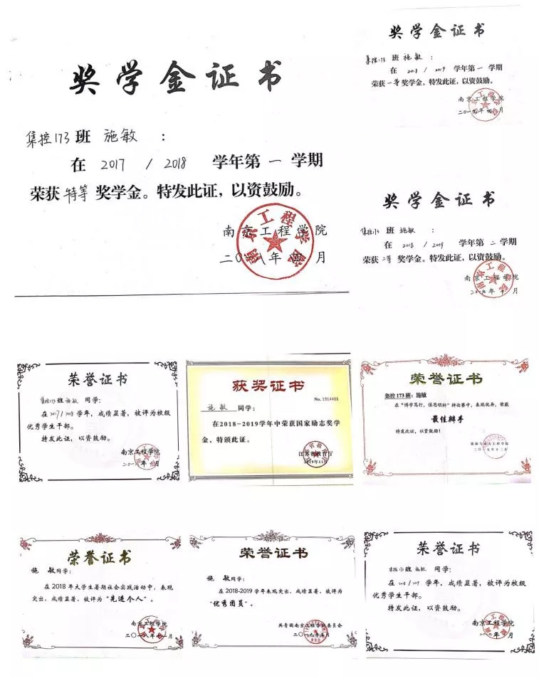 施敏,女,汉族,中共预备觉员,南京工程学院yl23411永利集团官网(火电厂集控运行)集控173班学生。入校以来先后获得国家奖学金、国家动志奖学金、校级特等奖学金、校级一等奖学金、校级二等奖学金、校级优秀学生干部、校级优秀团员、暑期社会实践校级先进个人等荣誉。