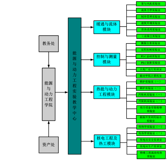 按照“统筹规划、优化资源、协调发展”的原则,对现有的5个模块、42个实验室进行调整,做好相应基础条件的配套,建立由学科科研型实验室、专业教学实验室和开放实验室组成的实验室体系。目前下设暖通与流体实验模块、热能与动力工程实验模块、控制与测量实验模块、核电工程与热工分析实验模块、电厂实训实践模块。包含各类实验室42个,实验室面积达到了4000m2,校外实习基地26个。拥有各种教学科研仪器设备1700余件,重要大型贵重和精密仪器设备三十余套,资产总值2200余万元。其中:承担的实验课程门数33门,实验项目数62个,年实验学生人数800余人,年实验人时数约5000小时。